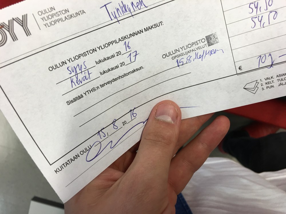 Sen lisäksi, että meidän on pakko kuulua ylioppilaskuntaan, meidän pitää myös maksaa siitä, muuten emme maksuttoman koulutuksen maassa saa opiskella. Tänä vuonna maksu oli Oulun yliopiston ylioppilaskunnalla 109€. Kävin maksamassa sen viime maanantaina ja nyt perjantaina kuvottaa, mitä tein. Annoin heille mandaatin edustaa poliittisesti itseäni, vaikka en ole heidän kanssaan samaa mieltä sekä rahoitin heidän toimintaansa. Mutta minulla ei ollut muuta vaihtoehtoa. Jos en vastoin tahtoani anna heille tätä valtaa, minun opintoni päättyvät kuin seinään: en saa enää opiskella. Sellainen edunvalvoja minulla on.